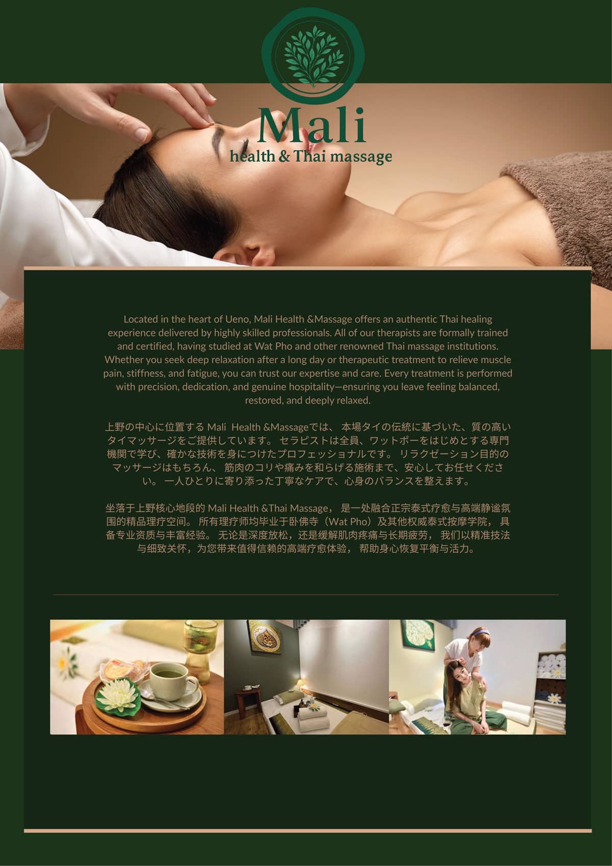 上野の中心に位置する Mali Health &Massageでは、 本場タイの伝統に基づいた、質の高い